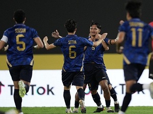 ![]() Tham dự SEA Games 33, U22 Thái Lan không có lực lượng mạnh nhất vì nhiều CLB không đồng ý nhả quân, nhưng họ vẫn được đánh giá cao hơn U22 Malaysia ở bán kết. Tận dụng lợi thế sân nhà, Voi chiến đẩy cao đội hình chơi tấn công ngay từ đầu. Phút thứ 8, U22 Thái Lan được hưởng quả đá phạt trực tiếp ở cự li thuận lợi. Yotsakorn tung cú sút đẹp mắt, bóng đi căng và găm thẳng vào góc gần, mở tỉ số cho đội bóng xứ chùa vàng. Thủ môn Zulhilmi đã bay hết tầm với nhưng không thể cứu thua cho U22 Malaysia. Bi kịch đã xảy ra với U22 Malaysia vì chỉ vài phút sau khi nhận bàn thua, họ còn phải chơi thiếu người. Hậu vệ cánh phải Aiman Yusuf đã bị trọng tài truất quyền thi đấu vì lĩnh thẻ vàng thứ 2 khi trận đấu mới chỉ trôi qua phút 15. Khó khăn chồng chất, U22 Malaysia chỉ còn biết co cụm chống đỡ. Phút 25, Ratree xâm nhập vào vòng cấm đón đường chọc khe của đồng đội nhưng anh dứt điểm chậm một nhịp, bị hậu vệ xoạc bóng ngay trong chân. 3 phút sau, U22 Malaysia được hưởng một quả đá phạt có góc sút và cự li tương tự quả đá phạt mở tỉ số của U22 Thái Lan. Harry Danish cũng quyết định sút thẳng, bóng đi có lực tốt nhưng thủ môn Sorawat chơi tập trung, cứu thua cho đội chủ nhà. Phút 39, U22 Thái Lan tổ chức tấn công nhanh, Iklas Sanron băng xuống với tốc độ xé gió, loại hoàn toàn các hậu vệ nhưng thủ môn Zulhilmi đã lao ra vòng cấm giải nguy. May mắn cho Hổ vàng vì trọng tài không rút thẻ đỏ cho Zulhilmi. ĐỘI HÌNH XUẤT PHÁT: - U22 Thái Lan: Sorawat, Chanon Tamma, Chanapach, Ratree, Sittha, Pichitchai, Thanakrit, Siraphop, Iklas Sanron, Phon Ek, Yotsakorn - U22 Malaysia: Zulhilmi, Aduibullah, Alif Ahmad, Hakimi, Faris Danish, Harry Danish, Ziad El Basheer, Aysar Hadi, Nabil Yusuf, Michel Raj, Haqimi Azim |