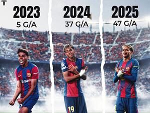 Kể từ khi lên đội một Barca năm 2023, thành tích ghi bàn và kiến tạo của Lamine Yamal tăng chóng mặt qua mỗi năm.